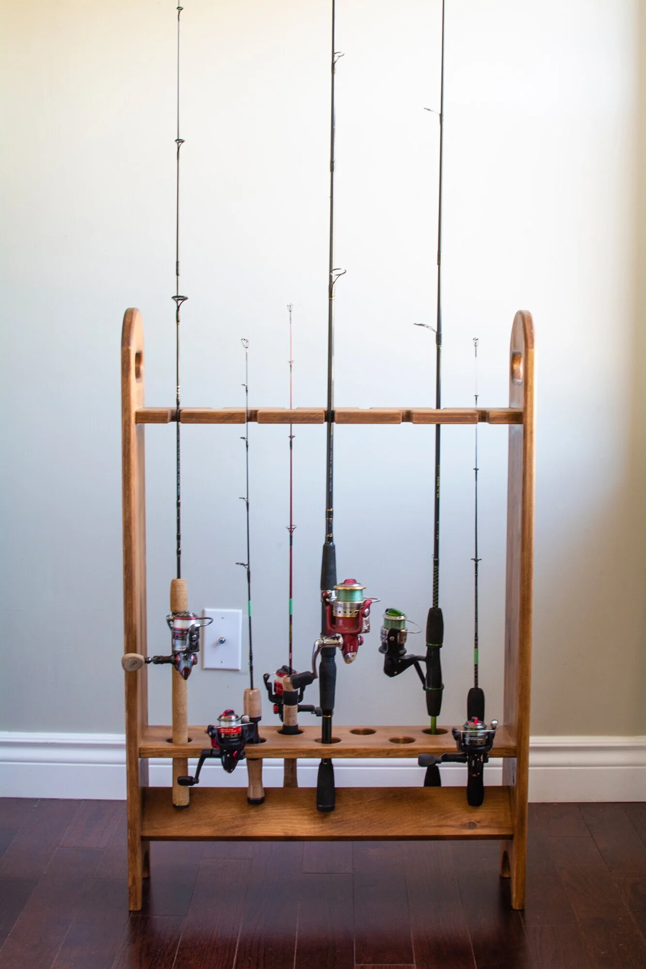 Keep your fishing rods organized and safe with a free standing rod holder. There is room for up to nine rods and reels of all types in this rod holder.